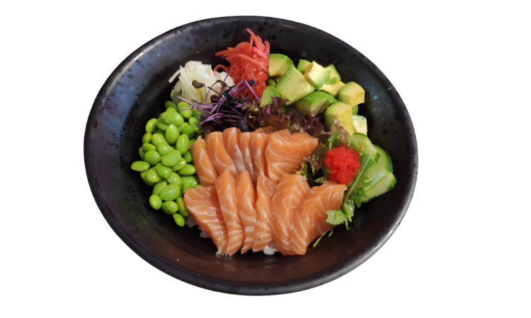 13 Stück Lachs Sashimi auf Reis mit verschiedenen Toppings, Ingwer, Wasabi und Sojasauce