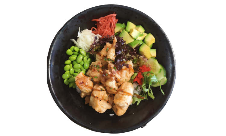 Knusprig frittiertes Hühnchen auf Reis mit verschiedenen Toppings und eine Sauce nach Wahl
